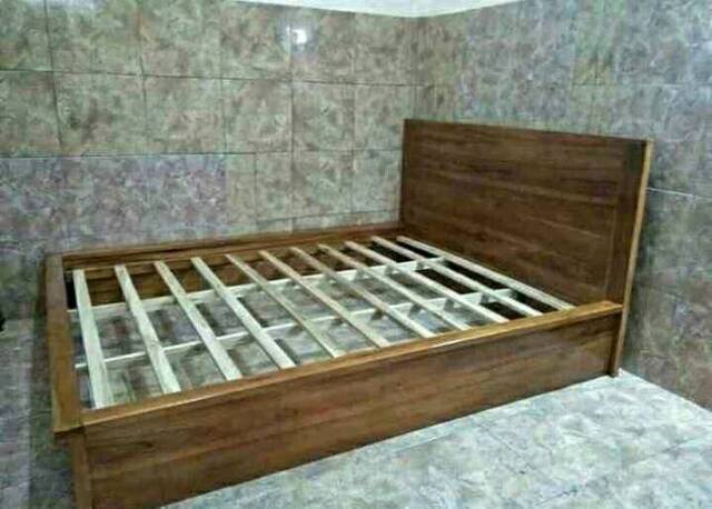 - Tempat tidur kayu dengan ukiran pada headboard